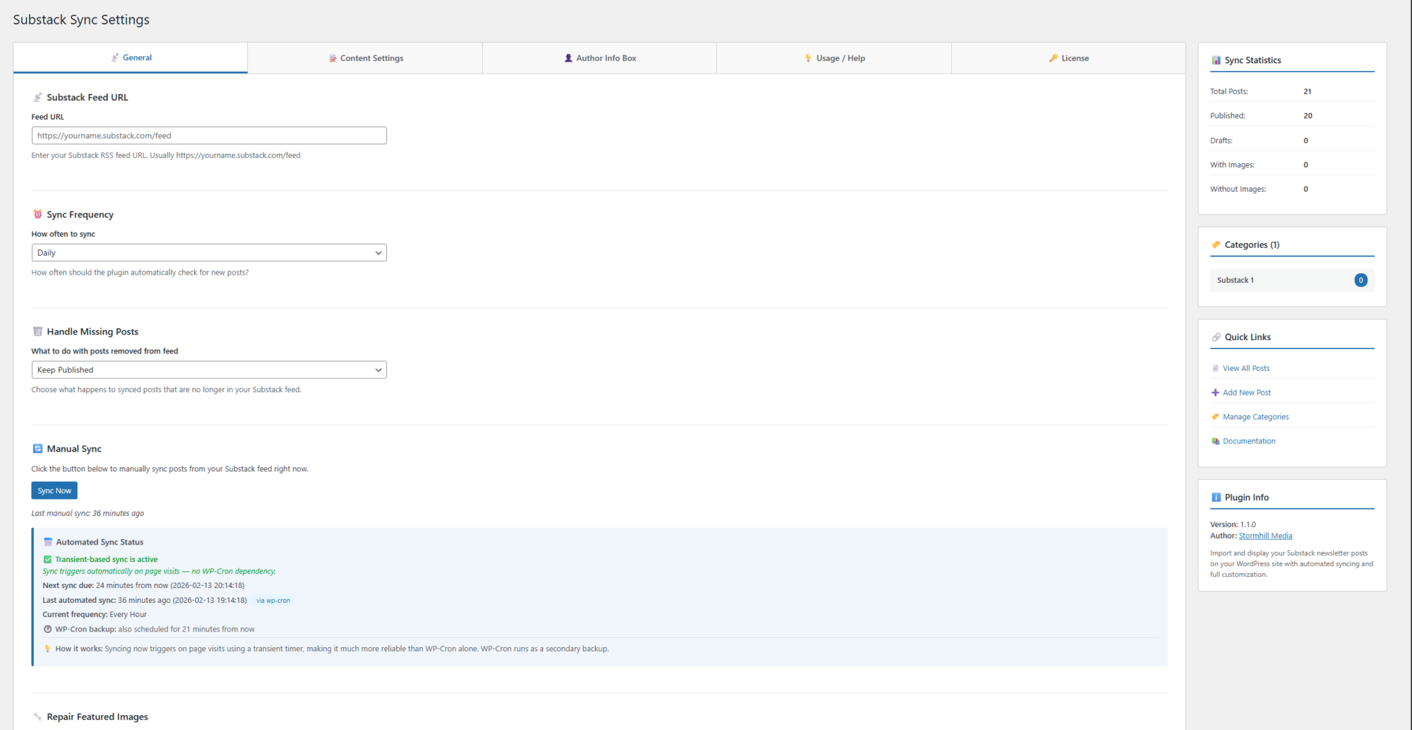 Substack Sync automatically imports your Substack newsletter posts into WordPress, giving you full control over how your content appears on your own domain.